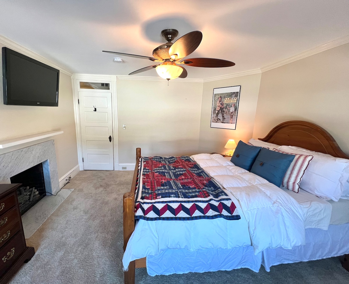 Welcome to the Wolfeboro Guesthouse; a fully renovated and customized home with modern updates that exude charm and character! The LLBean Room is a middle room on the second floor with a fireplace (electric) and mounted TV. The house features include a cozy living room with a gas fireplace, a butler's pantry with a coffee bar, a dining room, and two porches. The bath is shared, but a private bath may be possible. Inquire with the host.