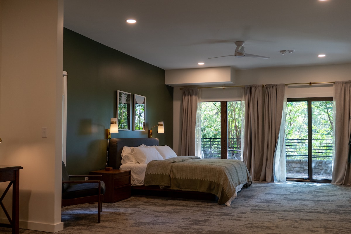 Enjoy a luxurious, ground level king suite with patio views as well as private attached outdoor entrance. Room features include: -One (1) King bed -Attached ensuite bathroom -Desk setup & additional lounge furniture -Private attached outdoor entrance to parking and patio -Covered outdoor walkway into the main lodge common areas -Dog-friendly!