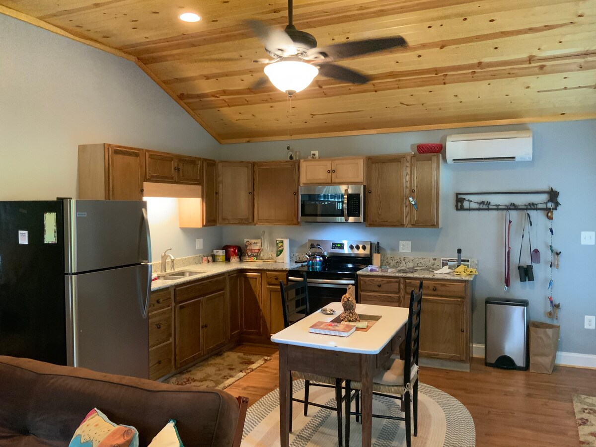 Situé sur l'un des Seven Bends de la rivière Shenandoah, le Bird's Nest est un tout nouveau chalet de 800 pieds carrés construit sur mesure et doté d'un loft ouvert avec lit King Size et puits de lumière, douche à vapeur, plancher de salle de bain chauffé et foyer au gaz. Les équipements extérieurs comprennent un jacuzzi, un barbecue à gaz, une table de foyer à gaz, un foyer au bord de la rivière et un accès privé à la rivière dans un cadre paisible et boisé. Des kayaks/bouées sont disponibles pour descendre la rivière avec la possibilité unique de se garer/sortir sur la propriété des hôtes.