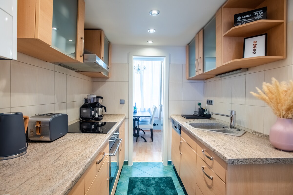 Appartement SUPERHÔTE au 2e étage avec ascenseur. Donnez-nous un ❤ - enregistrez cet appartement sur votre liste de souhaits personnelle ! Arrivée facile avec code d'accès - sans clé ! Lits à ressorts, y compris linge de lit, serviettes, shampoing, cuisine entièrement équipée, lave-linge, sèche-linge, WLAN haute vitesse, TV HD, chaise haute et lit bébé... et bien plus encore. Posséder une place de parking dans la cour. La propreté et l'hygiène sont très importantes pour nous. Professionnel ou privé ? Famille ou collègues ? Nous vous enverrons volontiers une facture avec TVA.