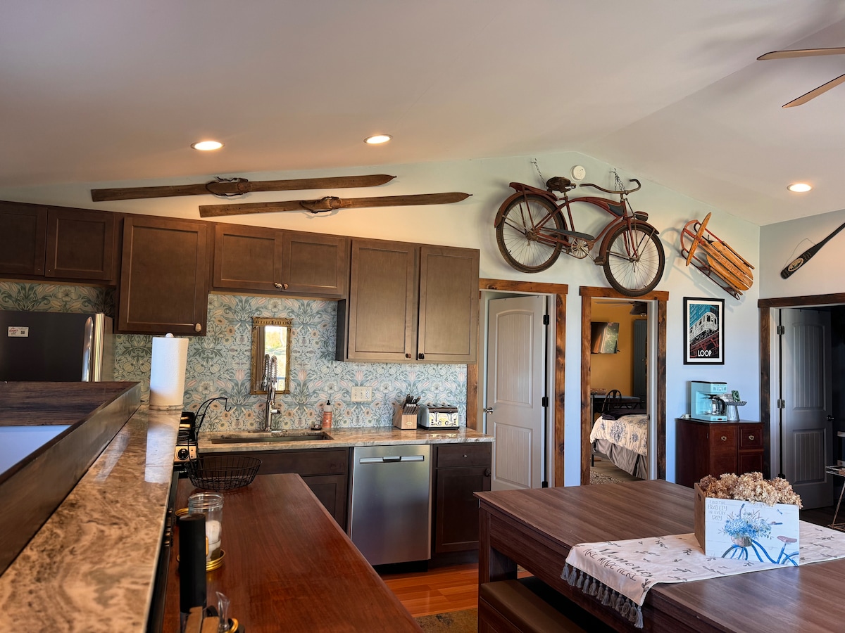 Maison entière au bord du lac avec beaucoup d'espace de couchage pour les familles. Quatre chambres et sept lits (en comptant deux lits gigognes). La maison a été récemment rénovée pour ajouter une véranda et transformer le premier étage en un concept ouvert avec une cuisine spacieuse et un salon. Il y a deux ensembles de lave-linge/sèche-linge au sous-sol pour accueillir de grands groupes. Traversez la rue jusqu'à Crystal Lake, promenez-vous deux pâtés de maisons jusqu'au centre-ville pour un repas ou passez du temps près du ruisseau et écoutez les grenouilles à la lumière du feu de camp.