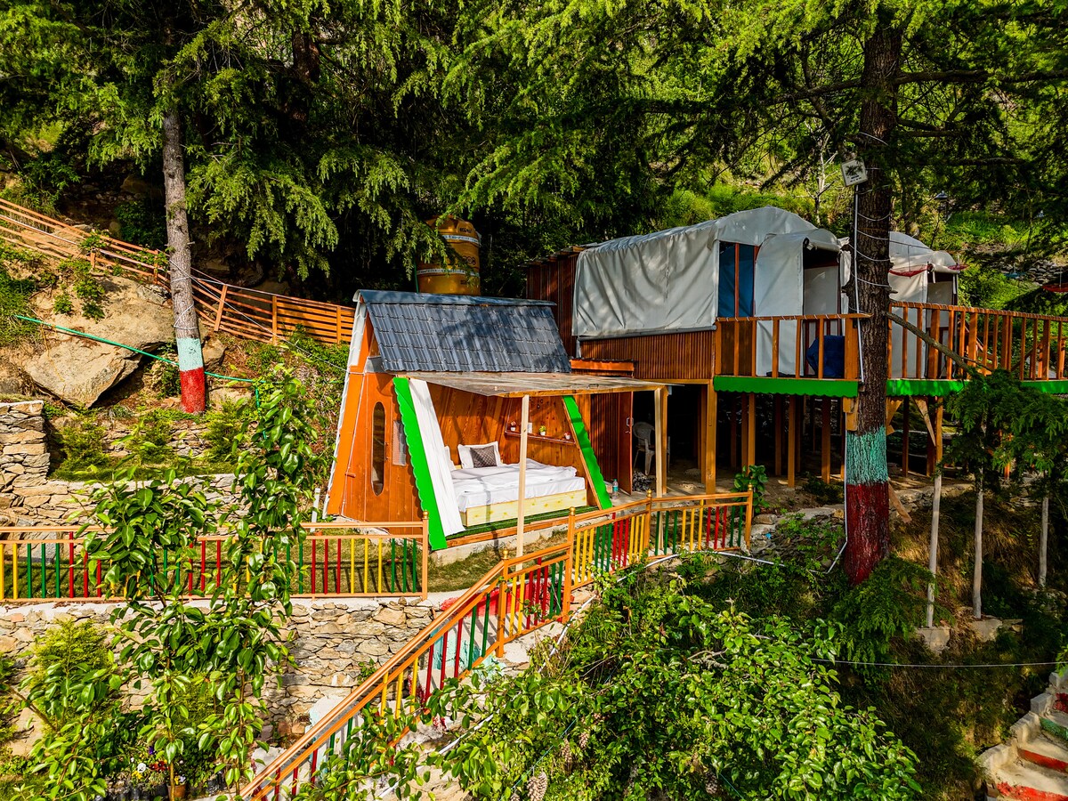 * Himalayan Ridge Glamping Domes est une destination parfaite pour les personnes qui recherchent des destinations uniques et moins fréquentées. * Situé à une hauteur d'environ 8 000 pieds. , Nos dômes décalés offrent une vue imprenable sur les chaînes de montagnes enneigées et la belle vallée. * Les attractions à proximité comprennent la cascade de Jana (2 km) et le château de Naggar (11 km). * La tranquillité de l'emplacement, associée à une terrasse privée, vous offre la possibilité de vous immerger pleinement dans le moment présent.