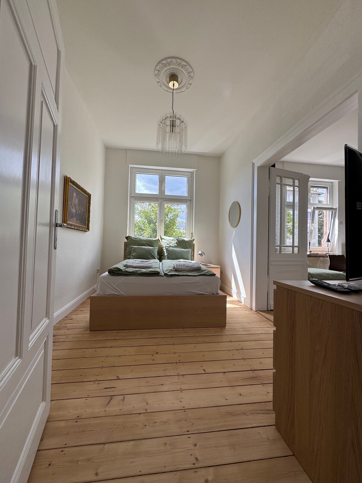 Le charmant appartement est aménagé avec une grande attention portée aux détails et offre à nos hôtes un maximum de calme et de confort. Un parquet de haute qualité dans tous les espaces de vie crée une atmosphère chaleureuse et agréable. Le salon, la salle à manger, la chambre et la cuisine sont ouverts et offrent une ambiance de vie généreuse. La salle de bain est équipée d'une baignoire jacuzzi. Et pour nos clients qui aiment cuisiner, notre cuisine entièrement équipée ne laisse rien à désirer.