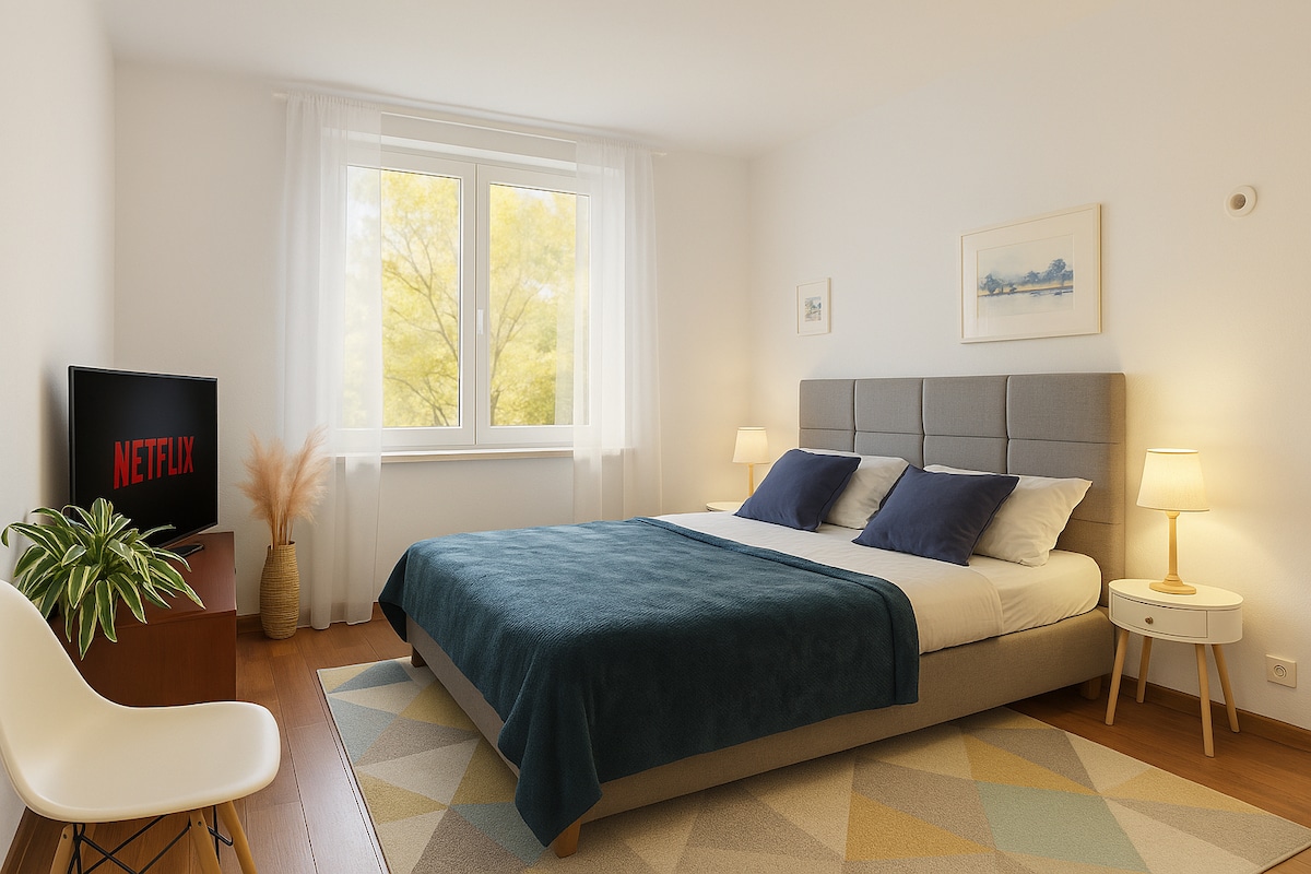 Très bel appartement. Il y a une cuisine avec un salon, une chambre, une salle de bains et une balkonie. Derrière l'immeuble, il y a une petite forêt et un joli parc. À environ 200 m de l'appartement il y a un centre commercial et un cinéma. Pour les voyageurs, il y a un parking souterrain avec un logement dédié Dans la cuisine pour le confort des voyageurs, il y a du personnel de cuisine de base comme du café, du thé, du sucre, du sel, de l'huile, des épices, etc. Le silence nocturne s'applique entre 22 h 00 et 6 h 00, il ne convient donc pas aux fêtes.
