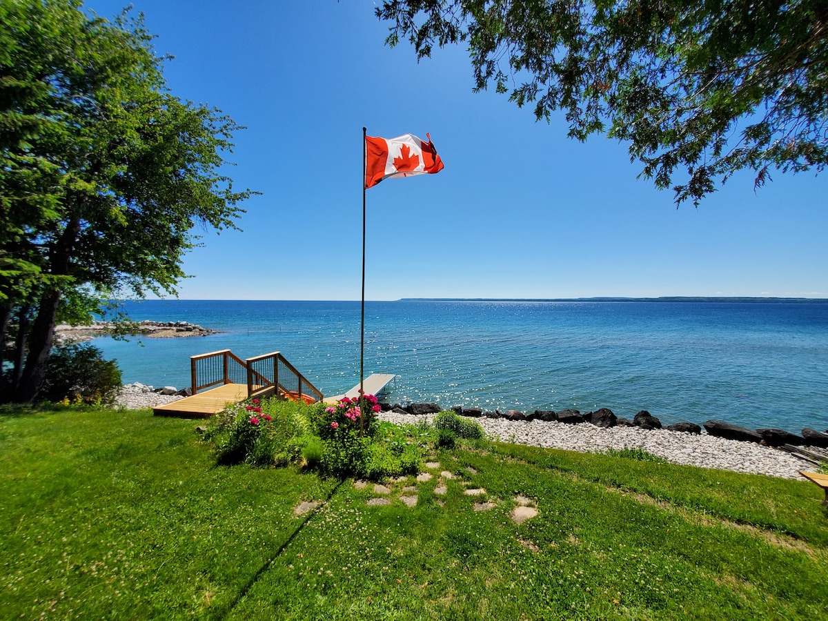 Chalet privé au bord de l'eau à 15 minutes au nord d'Owen Sound sur les eaux cristallines de la baie Georgienne. Avec 150 pieds de rivage partagés uniquement avec un chalet voisin, profitez des superbes levers de soleil, détendez-vous sur une chaise longue, allez nager, faire du kayak, du paddle board, aller pêcher ou faites un feu de camp et observez les étoiles. Utilisez notre chalet comme point de départ pour de nombreuses randonnées le long du sentier Bruce, de la plage de Sauble (35 min), de Tobermory (70 min) et bien d'autres encore. Ou travaillez simplement d'ici tout en profitant de la vue magnifique et du Wi-Fi.