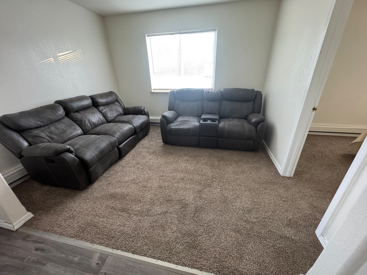 Appartement d'une chambre et d'une salle de bain à quinze minutes de la ville dans un cadre champêtre paisible. Si vous avez des affaires à Fort Greely, il n'est qu'à environ 20 minutes en voiture. Il y a beaucoup de places de stationnement gratuites disponibles avec location. Déménagement prêt avec lave-linge/sèche-linge, cuisine et salle de bain privées. Les produits de base de la cuisine et de la salle de bain ainsi qu'un supplément sont fournis. La chambre dispose d'un lit Queen Size confortable, d'un espace de travail privé, d'une cheminée électrique, de chaises et d'une télévision pour que votre séjour ressemble à une maison loin de chez vous.