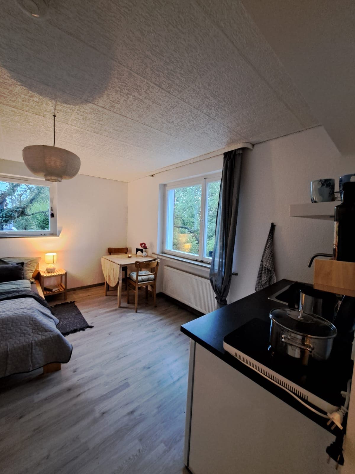 Tout en un. Dans cet appartement spacieux d'une pièce, tu trouveras tout ce dont tu as besoin. De la cuisine entièrement équipée à la douche à l'italienne en passant par un grand plan de travail. Le confort ne doit pas non plus manquer après la fonctionnalité. Cela offre un canapé moelleux avec TV ainsi qu'un coin salon de haute qualité, revêtu d'éléments en bois. Tu entres et tu te sens comme chez toi !