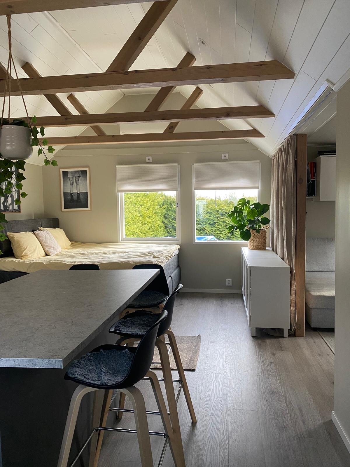 Un petit chalet confortable récemment rénové d'environ 50 m2 avec cuisine, chambre, salon avec canapé-lit et toilettes avec douche. La maison est située à Eggby, à environ 10 minutes en voiture de l'hippodrome d'Axevalla, du parc d'attractions Skara sommarland, de l'église du monastère de Varnhem et du lac Hornborgasjön. À distance de marche de la plage et à proximité de la nature et des pistes cyclables. À 300 mètres d'un magasin ouvert 24h/24 et 7j/7. Il y a 1 lit double, 1 canapé-lit et 1 lit bébé. Apportez vos propres articles d'hygiène, draps et serviettes. Animaux de compagnie acceptés. Il est interdit de fumer à l'intérieur.