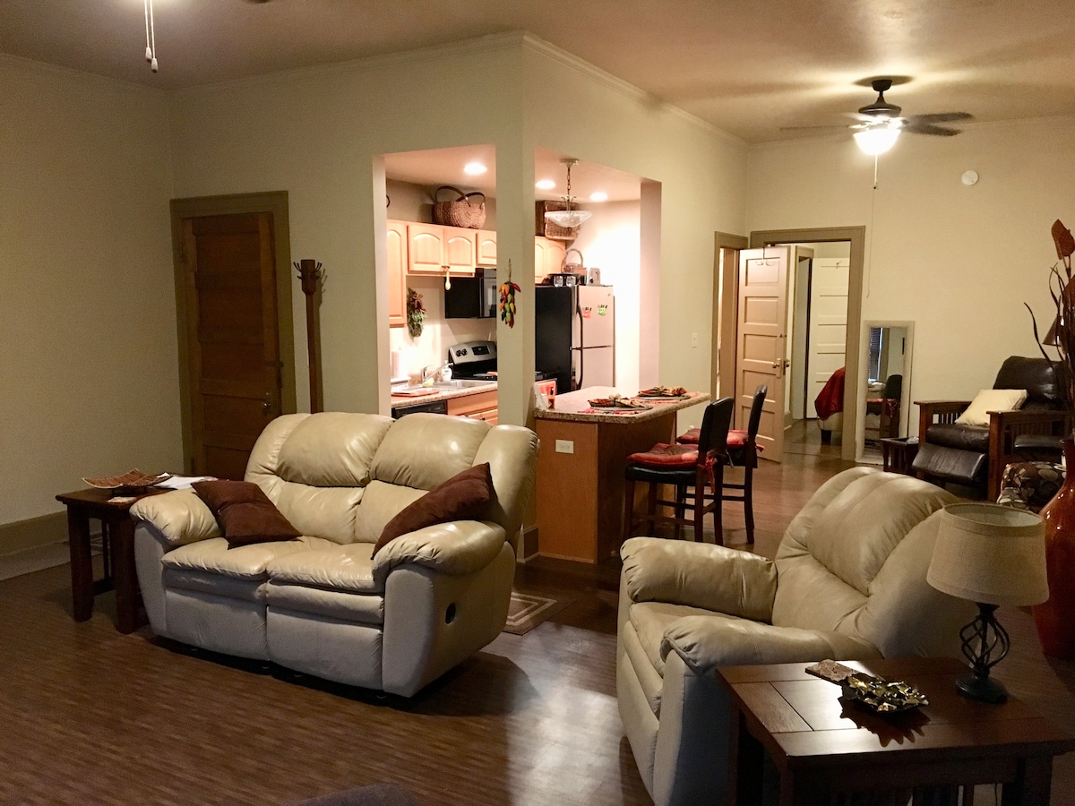 This space was designed with the whole family in mind! Settled in a great central location near parks and downtown this apartment has something for everyone. While the kids enjoy the playroom, you can be cooking a full meal in the full updated kitchen or relaxing in the large living room. Upstairs has 2 good size bedrooms and a bathroom. The dining room has a table large enough to eat a meal all together. The play room has everything from games, toys, forts, a reading nook, even their own TV!