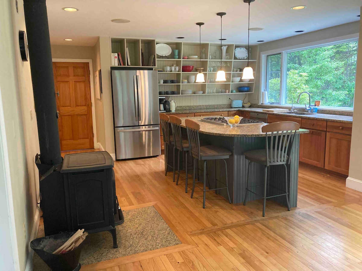 Maison de plain-pied récemment terminée à proximité de tout à Blue Hill. Le concept de plancher ouvert, les grandes fenêtres et la vue sur Blue Hill depuis le porche avant en font un endroit confortable où passer du temps ou une base pour des excursions d'une journée. Tout est à portée de main, que ce soit un court trajet en voiture, une belle promenade à pied ou à vélo, y compris les sentiers de randonnée, l'océan, la montagne Blue Hill, les restaurants, un café et des boutiques, ainsi que le Blue Hill Co-Op et Tradewinds pour vos besoins en épicerie.