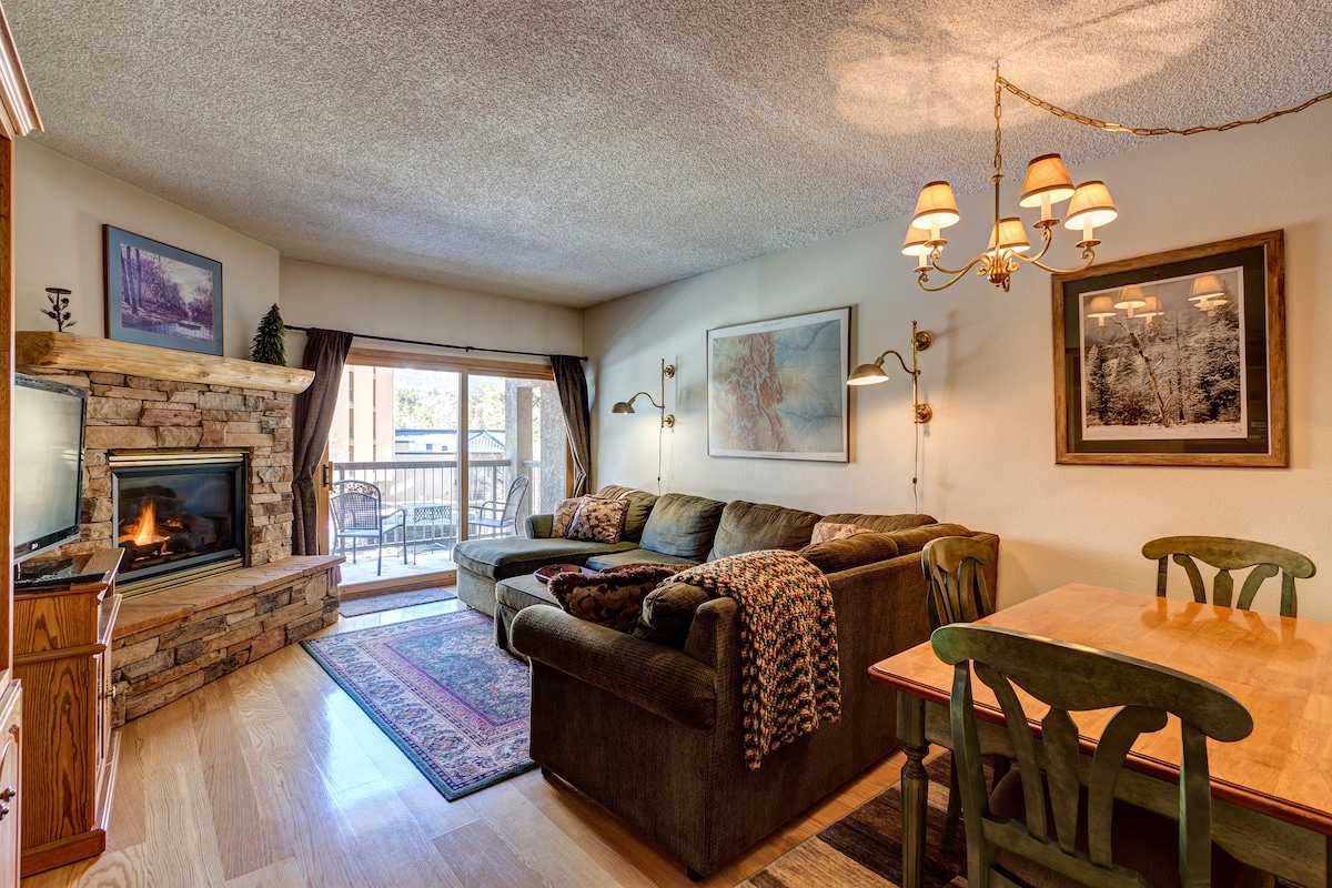 AC now through fall! Best location in town! The Peak 9/Quicksilver chairlift, Main Street & Blue River are all located within one block! Ski/bike rentals & Mi Casa Restaurant are downstairs. Sleeps up to 4: new king bed & queen sleeper sofa. Fully stocked kitchen, fast wifi, HD cable, balcony & shared hot tub! Free heated garage parking with possible early/extended access if parking spot is open for more time skiing or in town. Fully smoke & pet free unit. Fireplace no longer in use.