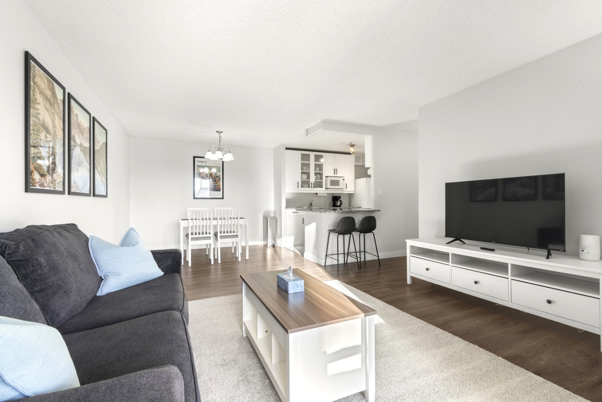 Wake up to stunning skyline views in this stylish 2-bed, 1-bath condo nestled in one of Calgary’s most vibrant neighbourhoods. Just steps from the downtown core, 17th Ave, Stampede Grounds, and some of the city’s best restaurants, cafes, and nightlife — you’re truly in the heart of it all. This sleek and modern space features 24/7 check-in, A/C, free underground parking, full stocked kitchen and bathroom. Basically everything you need for luxurious stay, we’ve thought of it.