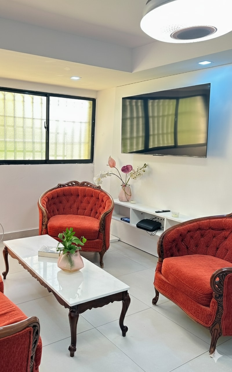L'appartement est pour 2 personnes et est au deuxième niveau ; il est très confortable, il a des espaces où vous trouverez l'harmonie et la tranquillité. Il y a la climatisation dans la chambre et dans le salon. Il dispose d'un lit Queen et d'un canapé-lit dans le salon, il dispose d'une terrasse de 20 m2. Le bâtiment dispose d'un étage électrique et d'un ascenseur. Un parking pour voiture ou jeep. Le bâtiment est fermé avec une caméra et une sécurité 24 h/24.