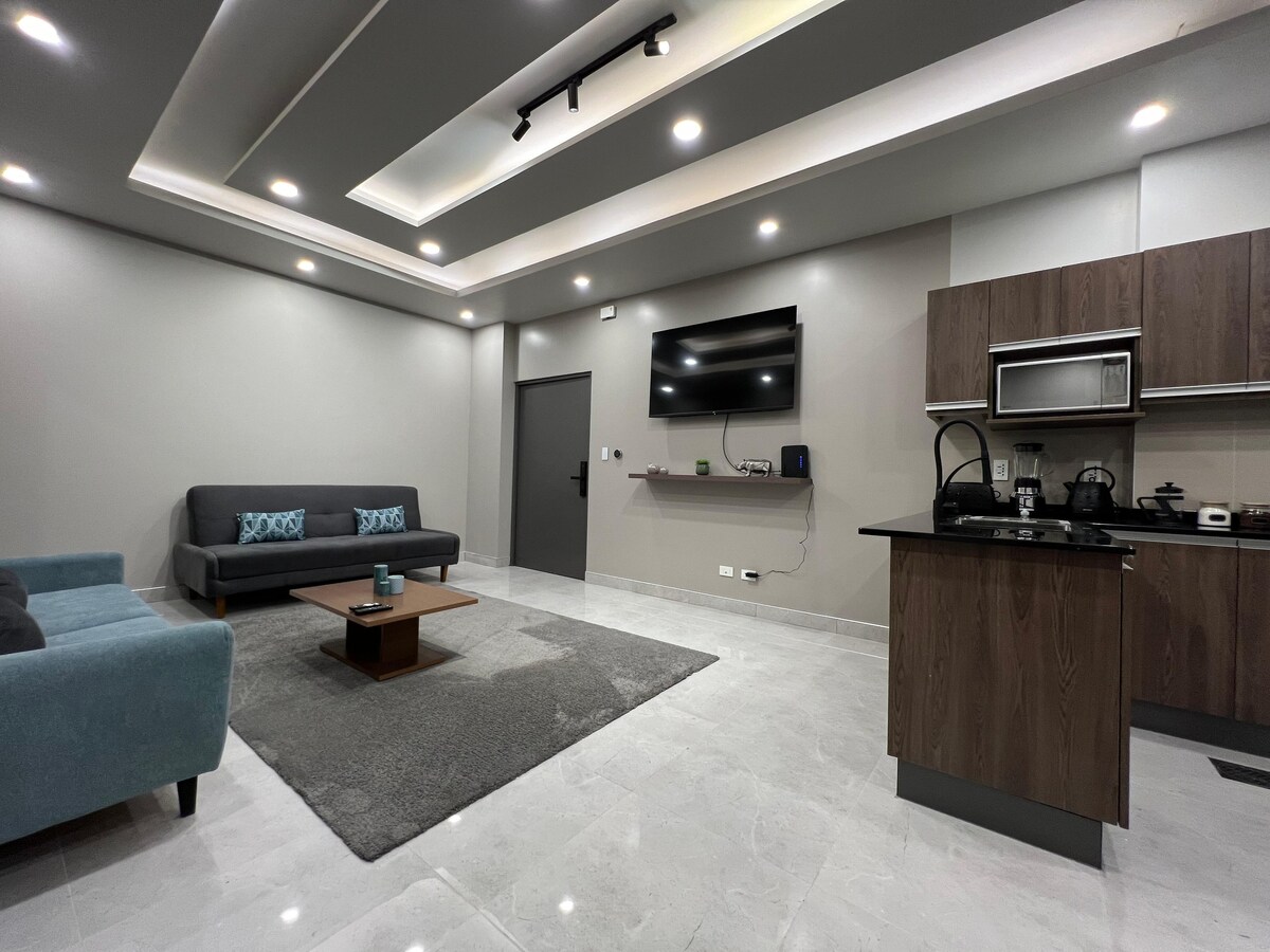 Appartement d'une suite, tout équipé et conçu pour votre confort avec différents espaces tels que la buanderie, la cuisine, le salon, et la salle à manger. Il dispose également de la climatisation, Internet WiFi, Alexa, Téléviseurs Smart, Chromecast IPTv, avec accès à plus de 400 chaînes de télévision et contenu des principales plates-formes de streaming. Nous avons une sécurité privée, un accueil et un service à la clientèle 24 heures sur 24. Nous offrons un petit déjeuner continental (en option)