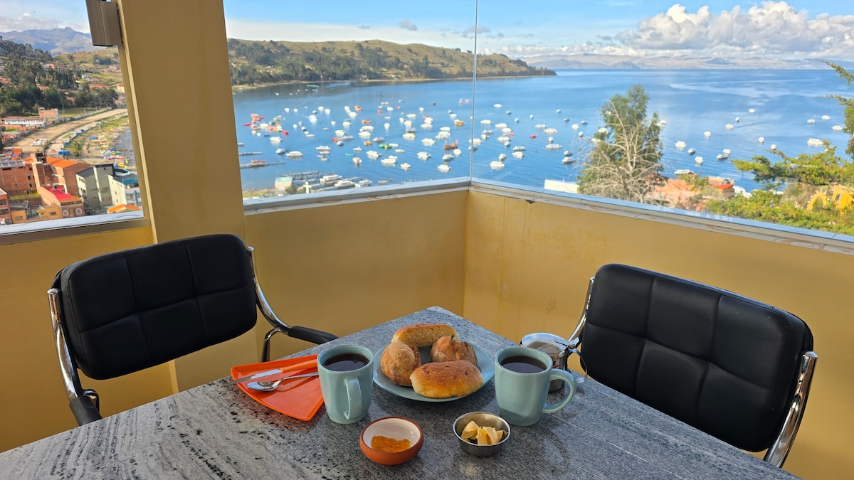 Profitez d'un séjour confortable et accueillant dans cette chambre spacieuse avec un emplacement privilégié à proximité de l'avenue principale du 6 août et de l'embarquement pour l'île du soleil. 🛏️ Ce que la chambre offre : • Lit queen size • Décoration murale peinte à la main avec une inspiration côtière méditerranéenne • Coin salon avec table ronde pour le travail. • Salle de bain privée et télévision par câble • Chauffage pour les climats froids • Bouilloire électrique 📍 Situé à l'Hôtel Lago Azul. A réserver maintenant !
