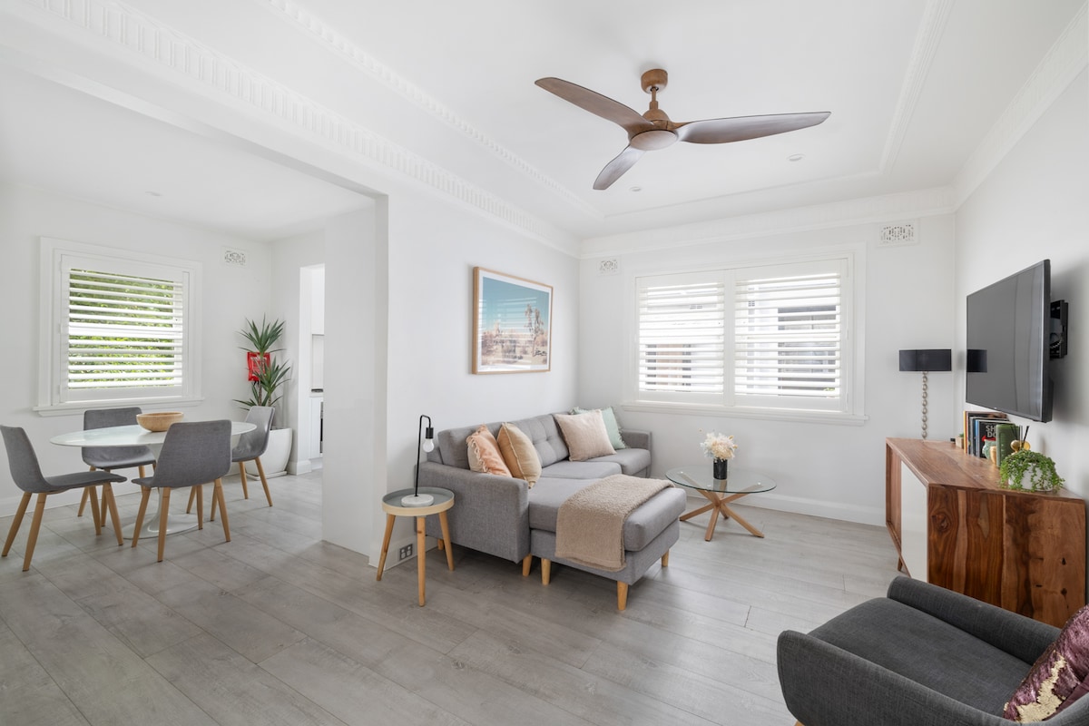 **Salle de bain rénovée flambant neuve** South Bondi Haven est un appartement de charme de deux chambres récemment rénové et magnifiquement décoré, prêt à vous accueillir. Parfait pour une escapade en famille, un week-end entre amis ou une retraite en couple - si vous recherchez une escapade côtière à Bondi, ne cherchez pas plus loin ! Idéalement situé à seulement 750 m de la célèbre plage de Bondi et des Bondi Icebergs, ainsi qu'à deux pas de restaurants tels que Totti's Bondi et The Corner House.