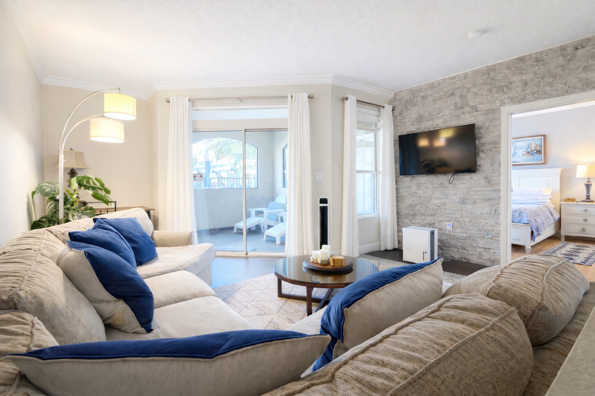 Réveillez-vous avec une vue sur le front de mer ! Sirotez votre café du matin sur un balcon privé de 6 mètres surplombant la baie de Boca Ciega, observez les dauphins, détendez-vous dans la piscine chauffée et le spa tout en admirant les couchers de soleil époustouflants. Cet appartement d'angle calme offre une escapade sereine à quelques minutes de Madeira Beach, de St. Pete et des attractions locales, parfait pour les couples ou les voyageurs en solo. Points forts : • Vue directe sur le front de mer • Piscine chauffée, bain à remous • Location de bateaux, sentiers et plage de Madère à proximité • 5 minutes des plages du golfe + 15 minutes du centre-ville de St. Pete