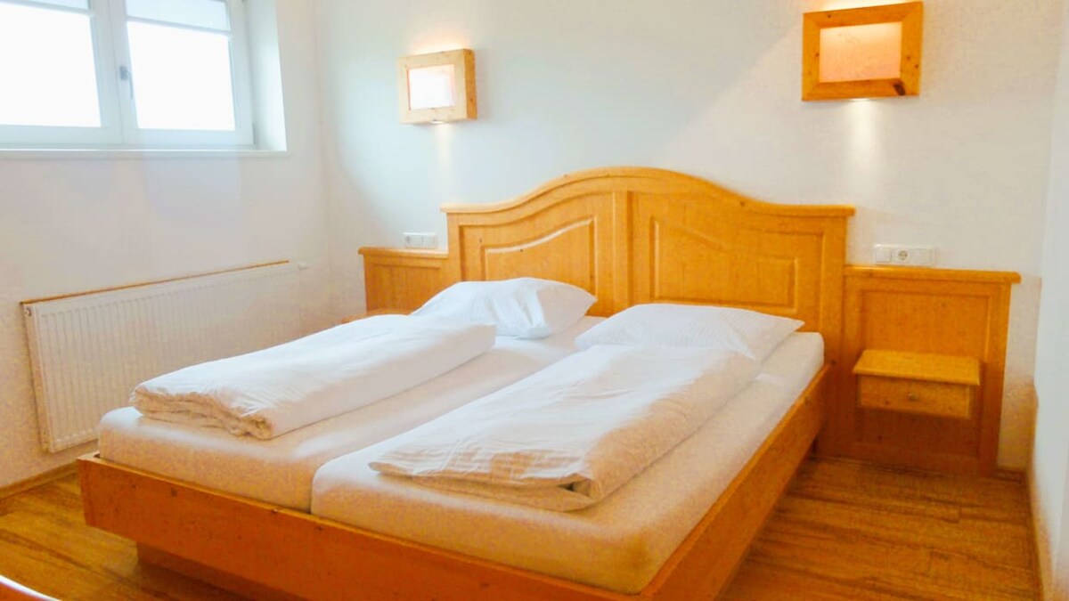 Experience cozy comfort in our charming double room. The room is lovingly furnished with solid wood furniture and exudes an inviting atmosphere. Enjoy breathtaking views of the majestic mountain landscape. The bathroom is equipped with a shower, toilet, hairdryer, mirror, fluffy towels, facial tissues, a practical towel dryer, and refreshing soap to ensure you feel completely at home.