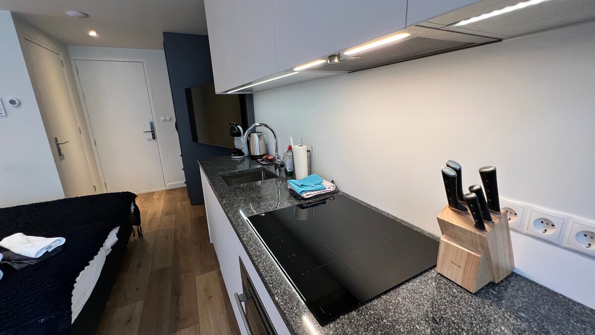 This studio has a fully equipped kitchen, dishwasher, combi oven-microwave, refrigerator with freezer and a 4-burner induction hob. Also an airconditioner (split-unit), dining table with 4 chairs, Qled 55" SmartTV, boxspring double bed, bathroom with shower and toilet and very fastWiFi (250Mbit). In connection with the location please take the neighborhoods into account and for protection there is a security camera in the public hallway. Also no visitors allowed unless consulted with the owner.