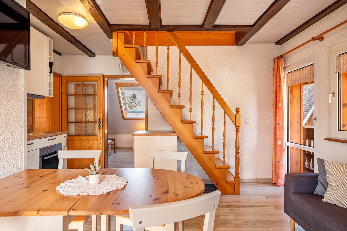 Détends-toi dans notre hébergement spécial, pittoresque et confortable. Se sentir bien dans un petit espace n'est pas un compromis dans cet appartement. La cuisine-salle de séjour est équipée d'une cuisine entièrement équipée, de sièges et d'un coin repas. Notre sapin blanc est adapté pour un maximum de 2 personnes. Le balcon sud avec vue imprenable sur le Feldberg et le vaste paysage de la Forêt-Noire te permet également de te reposer.
