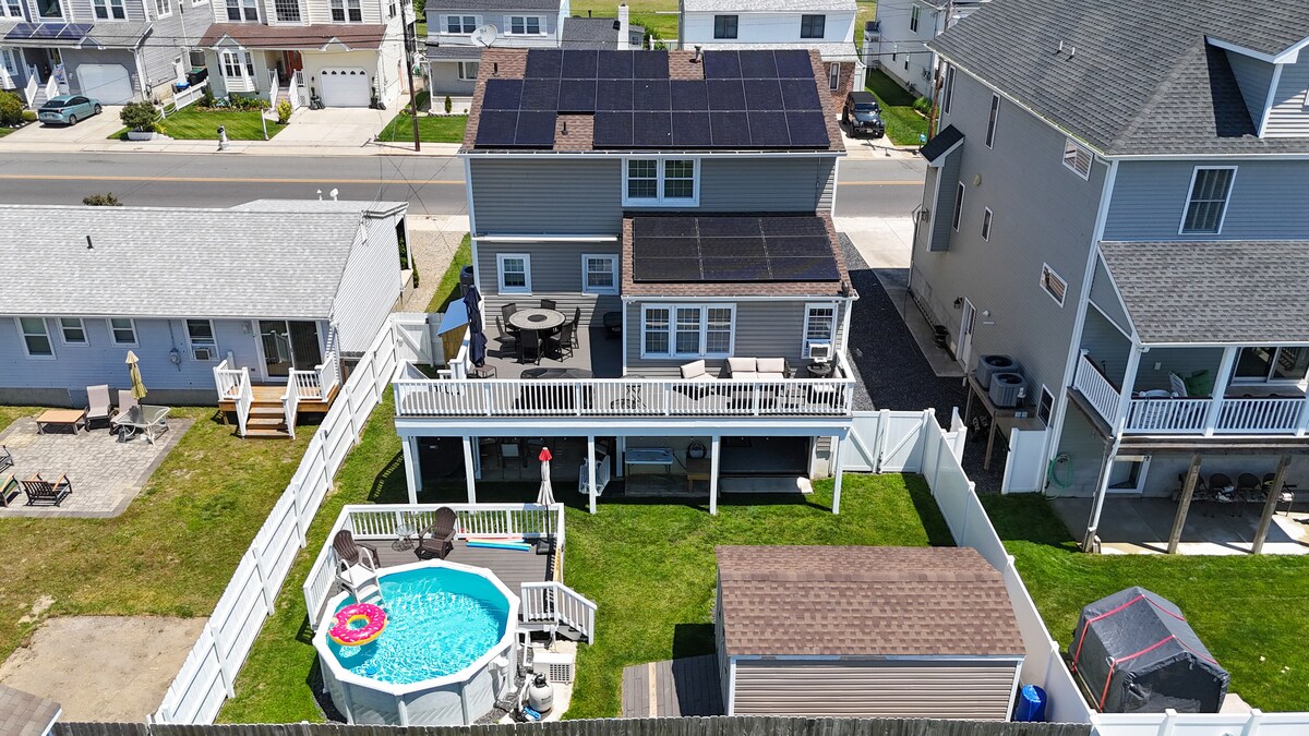 Cette maison de plage spacieuse est parfaite pour les familles, offrant 3 chambres plus une chambre supplémentaire avec un lit queen size, un salon et un coin détente. Profitez de la salle de jeux amusante avec plus de coin salon, TV, ping-pong, cornhold, jeu de fléchettes, basket-ball intérieur et une table de poker. Profitez de la piscine hors sol et du grand espace extérieur avec un foyer, une table à manger et une douche extérieure. La maison dispose également d'un ascenseur du rez-de-chaussée à l'étage principal pour un accès facile. À seulement 3 pâtés de maisons de la plage.