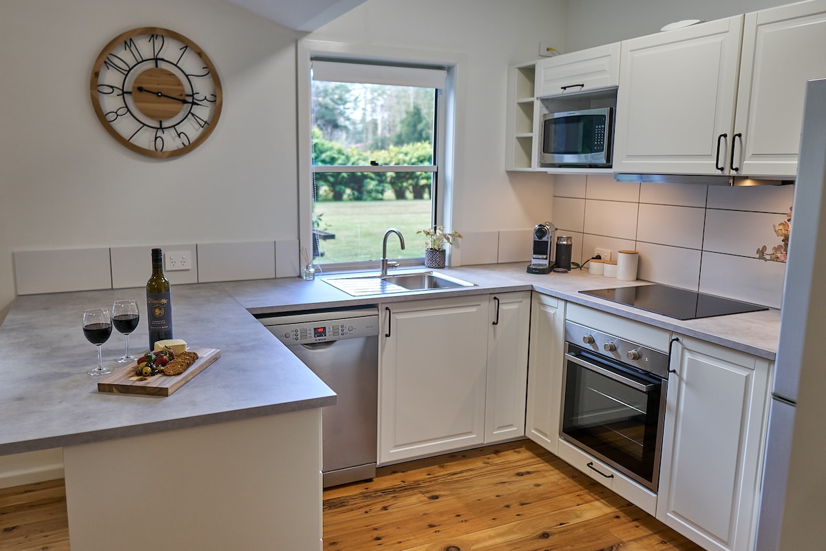 Réductions pour 3 nuits + Détendez-vous dans cette escapade romantique de 2 chambres et 2 salles de bain située dans les charmants environs d'un verger de loisirs florissant. Sur la superficie de la colline, détendez-vous sur la terrasse, sentez les brises côtières et écoutez les oiseaux tout en profitant de la vue sur la vallée. Profitez du luxueux bain avec vue, laissez-vous envoûter devant la cheminée confortable. Regardez les étoiles tout en profitant de la chaleur du foyer extérieur. Faites un barbecue sur la terrasse. Goûtez nos produits maison. Tout cela à seulement 10 minutes des commerces et des plages.