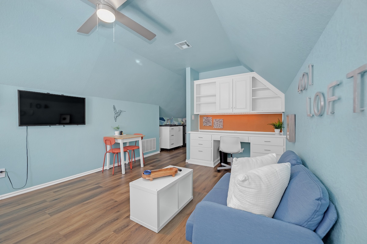 Perfect for relatives visiting family! Designed to offer top tier comfort, in a safe & quiet neighborhood, so you can relax in style. Recently remodeled at 350 sq ft, the Loft perfectly accommodates single travelers, couples, & pets who can play in the shared fully fenced backyard! Remote work here is a breeze! Take use of high speed wi-fi, large built-in desk, & kitchenette stocked with coffee! Plus! Up your relaxation to the next level by reserving the HotTub amenity at $20/night!!