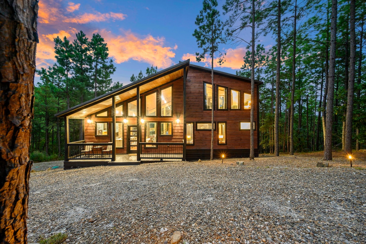 Profitez du summum du luxe moderne et de la détente sereine dans ce nouveau chalet de plain-pied, acceptant les animaux de compagnie et au design haut de gamme, niché parmi les pins imposants dans une impasse privée. 2 chambres privées identiques avec lit King Size disposent chacune d'une salle de bain spa attenante et d'un accès direct au patio et au jacuzzi depuis chaque chambre avec une connexion Wi-Fi fiable et rapide pour rester connecté ! Idéalement située à Hochatown, à seulement 5 minutes du parc Beavers Bend, des attractions et des restaurants, cette retraite offre tout ce dont vous avez besoin pour une escapade amusante et une expérience de haut niveau !