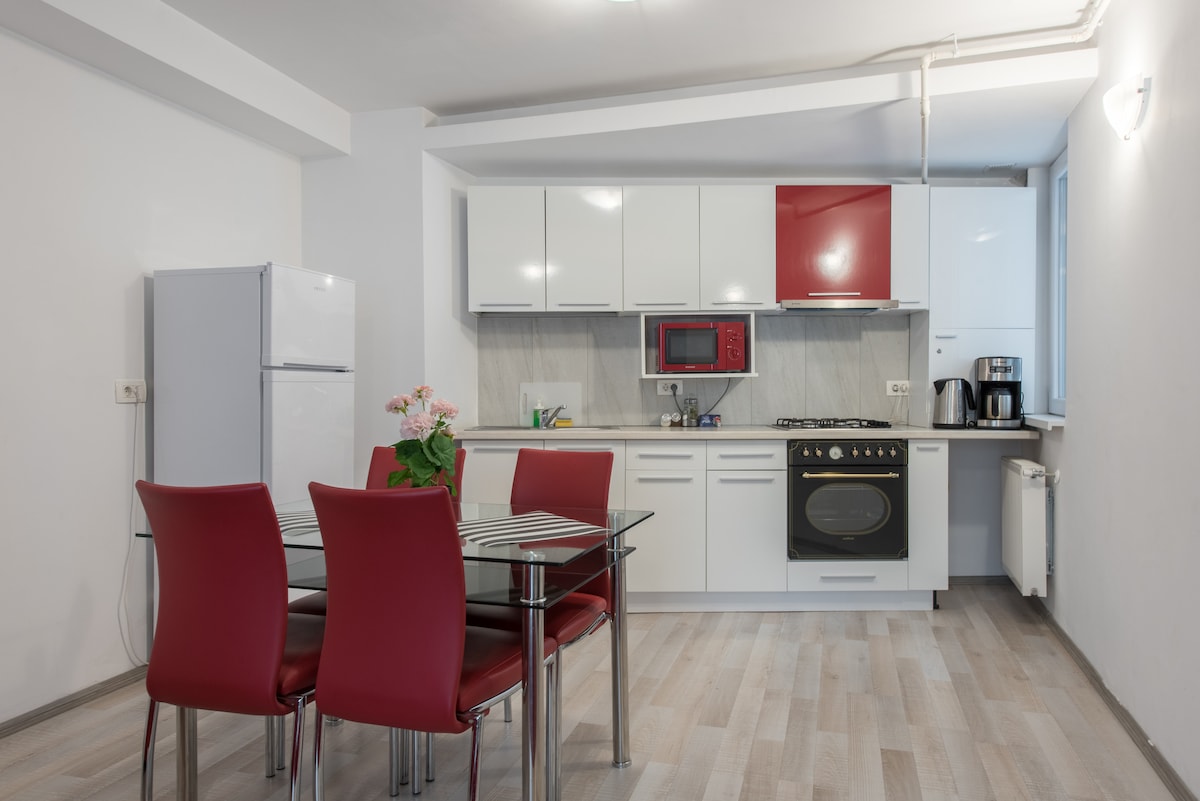 Appartement de 75 m ² idéalement situé, près de l'avenue Victoriei et de la place de la Révolution, également en face du magnifique parc Cismigiu. Les voyageurs profitent de 2 chambres complètement séparées et d'un double salon qui peut être transformé, en cas de besoin, en une 3ème chambre qui bénéficie d'une intimité totale du salon en fermant les portes vitrées épaisses qui ont des rideaux opaques. 2 salles de bain complètes et une kitchenette entièrement équipée sont disponibles. Nous pouvons fournir des transferts aéroport et des visites guidées.