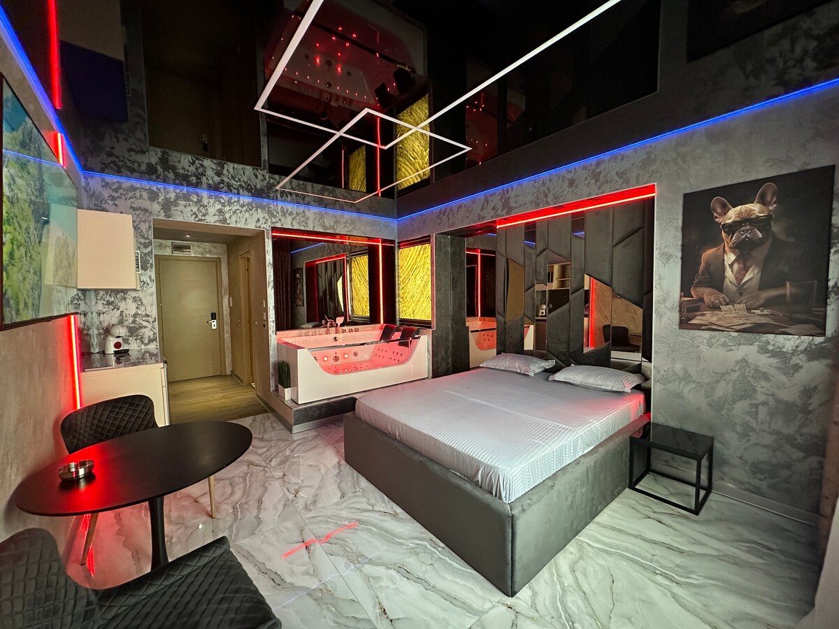 L'emplacement offre un grand jacuzzi pour 2 personnes avec 48 jets, chromothérapie, lumières d'ambiance, eau chauffée, désinfection à l'ozone, bluetooth et radio, côté aquarium. Grande télévision connectée Lit confortable pour 2 personnes Réfrigérateur avec congélateur Machine à café (thé et café gratuits) Climatisation centralisée Ventilation Chaussons, peignoirs, serviettes Verres, vaisselle, couverts PLACE DE PARKING GRATUITE Sécurité à l’entrée du bâtiment 24 h/24 LE SPA ET LA SALLE DE SPORT SONT PAYÉS SÉPARÉMENT.