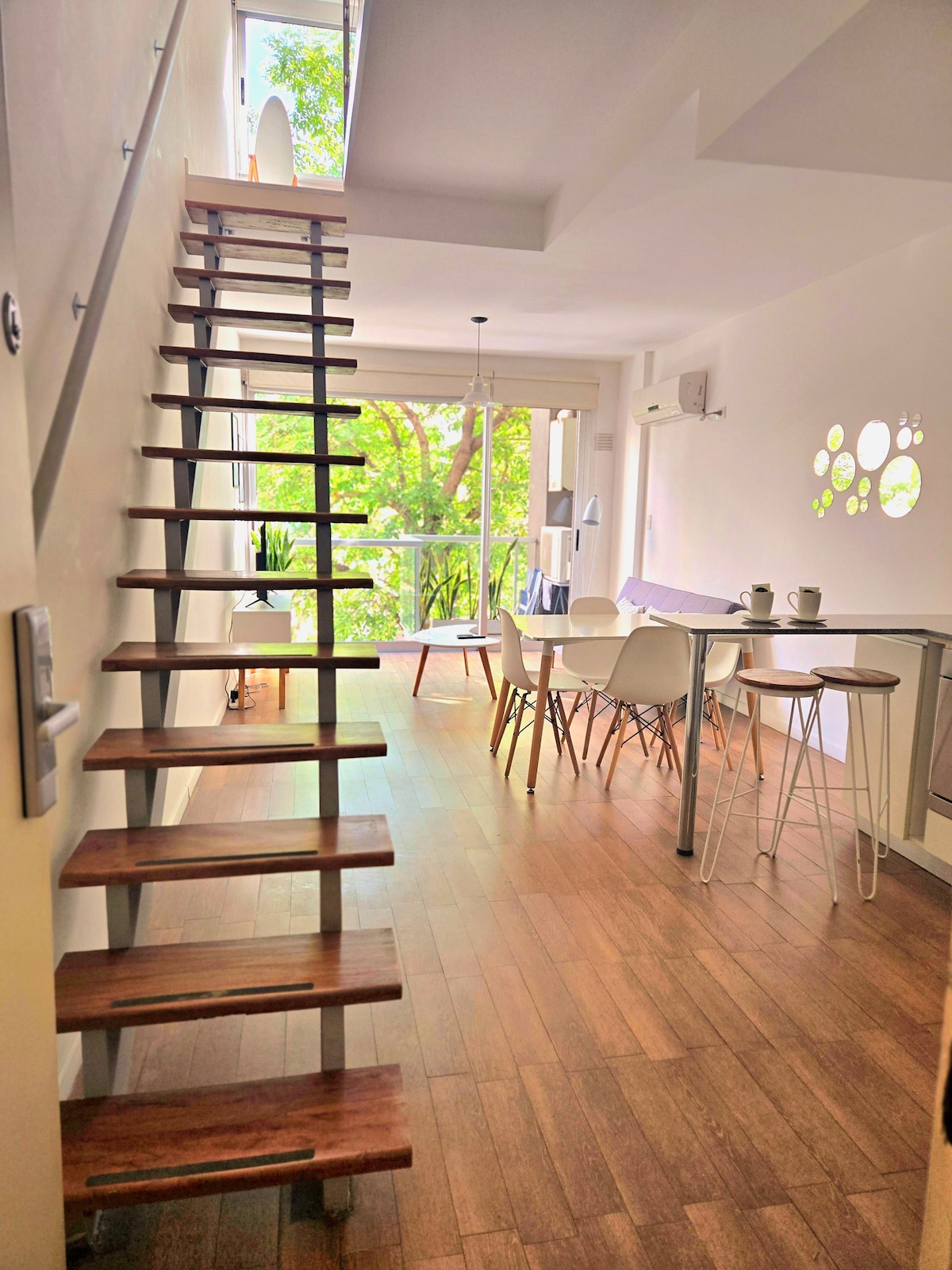 Located in the historical Pasaje Santamarina, close to the heart of San Telmo, and reached through one flight of stairs, it has a living area with a fireplace and an integrated kitchen, 2 bedrooms (one in an open mezzanine, with a desk), an entertainment center with an LCD TV (with Chromecast, no cable), a bathroom (with shower box, no tub), and a walk-in closet. Features Wi-fi connection and a central air conditioning system. Very quiet and light-filled. Easy access to Buenos Aires attractions.