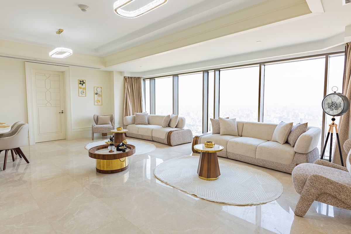 This Apartment is Offered By Dhbstays , The 2-Bedroom Partial Nile View suite at the St. Regis Hotel offers an blend of luxury, comfort, and breathtaking views. With two elegantly appointed bedrooms, this suite is designed for both relaxation and sophistication, making it ideal for families or those seeking extra space. Floor-to-ceiling windows frame panoramic views of the iconic Nile River, offering a serene and picturesque backdrop.