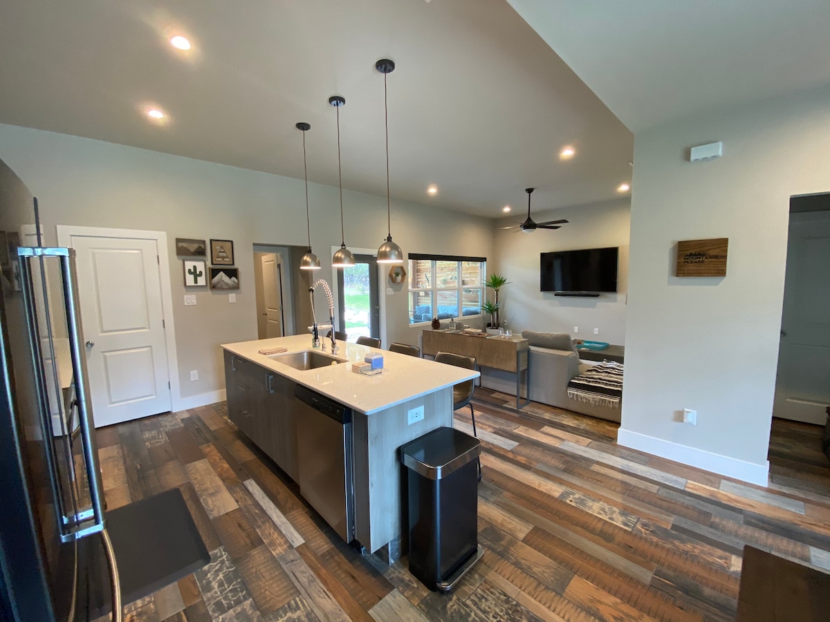 Maison moderne au bord d'un lac avec un design unique. Esthétiquement agréable avec un mur d'intimité en cèdre avec des jardinières succulentes qui peuvent être vues depuis le séjour. Divertissement dans l'arrière-cour avec télévision et mobilier d'extérieur. Profitez de la campagne avec des cerfs qui visitent fréquemment la cour arrière. Accès privé au lac/à la rivière dans le quartier !! La rampe de mise à l'eau 11 est également dans le quartier ! Le quartier est relié à l'endroit où se trouve le lieu de mariage Hidden Falls !