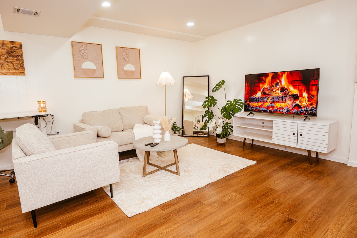 Nous vous accueillons dans un appartement spacieux et privé au sous-sol avec sa propre entrée et son arrivée autonome. Installez-vous confortablement avec vos invités dans un espace qui dispose d'une chambre avec un lit king-size, d'une télévision intelligente de 85 pouces, d'un canapé d'angle moelleux, de toilettes privées, d'une salle de bain et d'une kitchenette, le tout dans le même espace. Aucun des équipements n'est partagé. La kitchenette entièrement équipée a tout ce dont vous aurez besoin pour cuisiner et réchauffer vos repas. La suite d'invité est l'appartement entier du sous-sol qui fait partie d'une plus grande maison où vit l'hôte.
