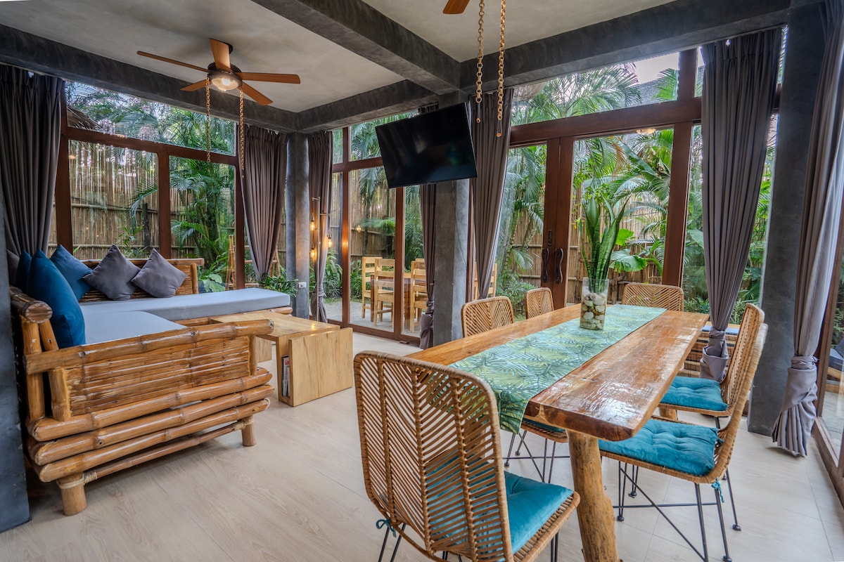 Notre villa familiale emblématique offre une retraite en bord de mer incomparable. Sortez, vous disposez de votre propre piscine à débordement privée avec un coin salon de soleil et un coin repas décontracté. À l'intérieur, profitez d'un salon spacieux avec une cuisine ouverte et un coin salon. Deux chambres principales du rez-de-chaussée disposent de salles de bains semi-extérieures, de lits king size et de téléviseurs intelligents. À l'étage, deux chambres supplémentaires offrent des lits king size, des douches et des lavabos, avec toilettes privées partagées. Détendez-vous dans la nature sur le grand balcon.