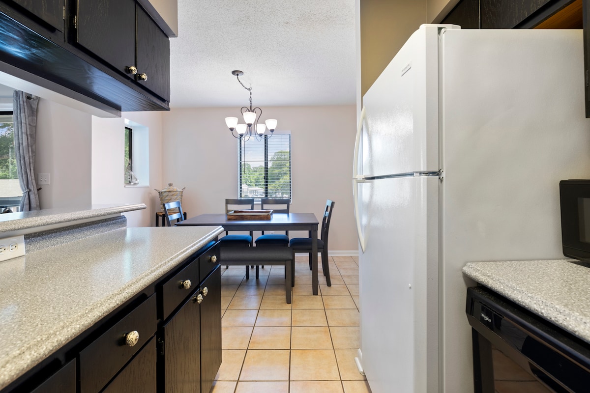 À seulement quelques pas de la plage, cet appartement récemment rénové d'une chambre et d'une salle de bain est idéalement situé dans un complexe bien entretenu avec une vue imprenable sur l'eau de Jinks Creek. La chambre privée comprend un lit King Size, un placard et une télévision connectée. Ce logement peut accueillir confortablement 4 personnes avec un matelas taille Queen en gel amélioré dans le canapé convertible. Utilisez notre équipement de plage tout en passant la journée entière à la plage et profitez des couchers de soleil depuis la terrasse.