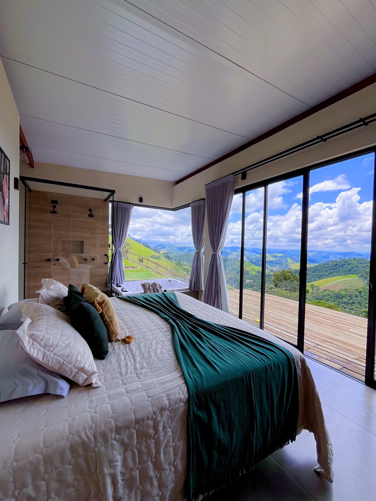 Refúgio romântico em meio à natureza, ideal para casais. Chalé estilo suíço (A-frame) em sítio cercado por cafezais, com rio e cachoeira particulares. Possui banheiras externas com vista para a Serra da Mantiqueira, jacuzzi interna, fogueira, churrasqueira, quadra de beach tênis, cama-balanço, sauna seca com vista e projetor interno com telão de 100”.