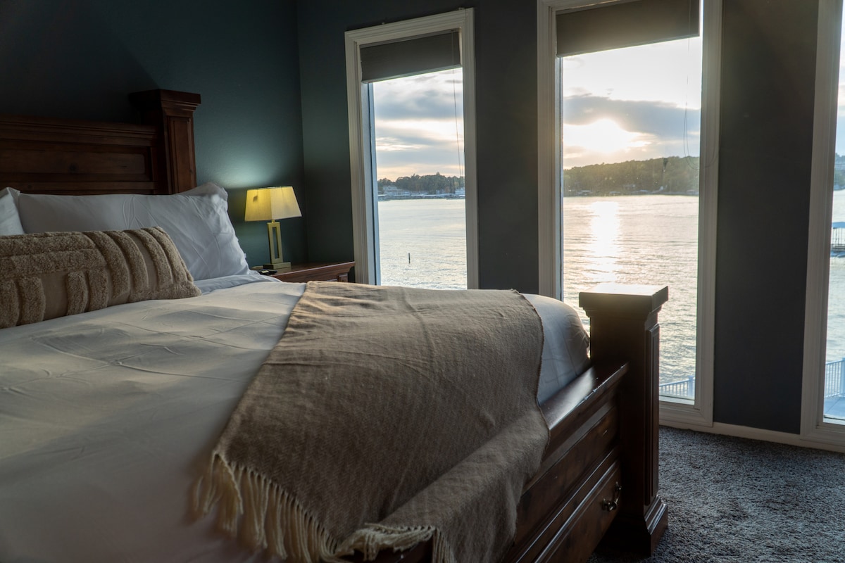Superbe appartement d'une chambre avec lit king size situé à Osage Beach. Vue imprenable ! Couvert, terrasse abritée donnant sur le lac. Salle de bain SPA rénovée avec marbre italien. Parquet en bois dur partout. Emplacement de la crique/repère 21 miles. Les équipements comprennent une cale de mise à l'eau pour la location de bateau, la pêche, une cheminée et une piscine ! Beaucoup de bons restaurants, de superbes magasins et des activités amusantes à faire par terre/eau. Profitez toute l'année avec un chauffage de patio et un foyer électrique ! Disponible pour un bail à court/long terme, également