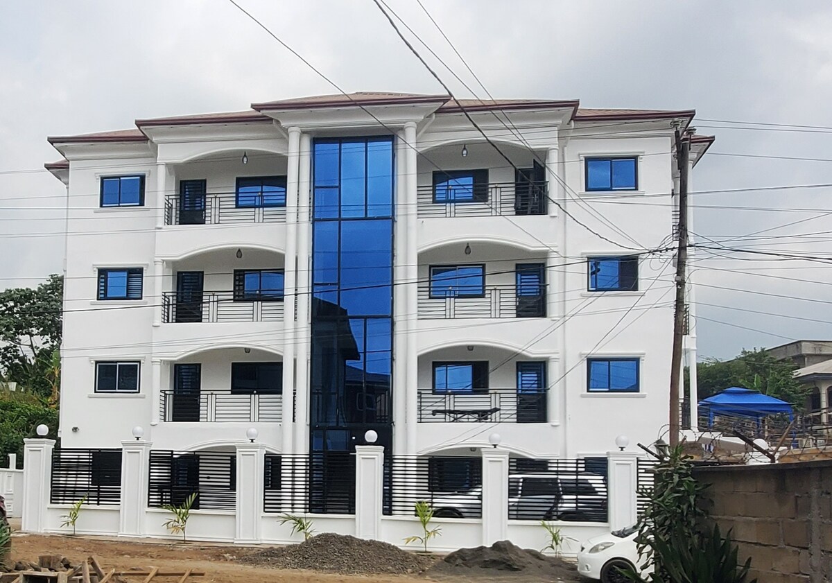 Séjournez dans un lieu haut de gamme proche de tous les sites qui vous intéressent. Chambre simple (semblable à un hôtel) dans ce complexe haut de gamme. Restaurant sur place. Belle vue sur le mont Fako. Luxe moderne, avec divertissement et réfrigérateur dans chaque pièce. Hautement sécurisé. L'ensemble est situé sur la rue Mayor, à côté de l'hôpital St Pius (hôpital INCORECT). Vous ne pouvez pas le manquer.