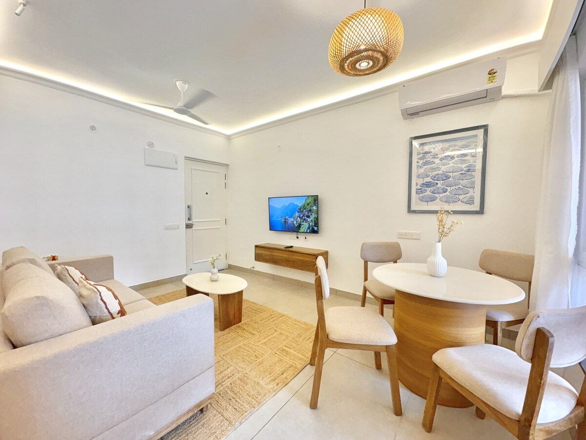 Kanso by Earthen Window is a quiet 1BHK in Siolim, shaped around earth, light, and privacy. Designed for slow mornings and unhurried evenings, the interiors are done with limewashed walls, soft microconcrete floors, and thoughtfully chosen objects that gives it a villa like charm. The bedroom opens to a PRIVATE GARDEN TERRACE and a secluded microconcrete hot tub with JACUZZI, both overlooking uninterrupted green forest. Shared amenities include a pool, steam room, gym, and 24×7 security.