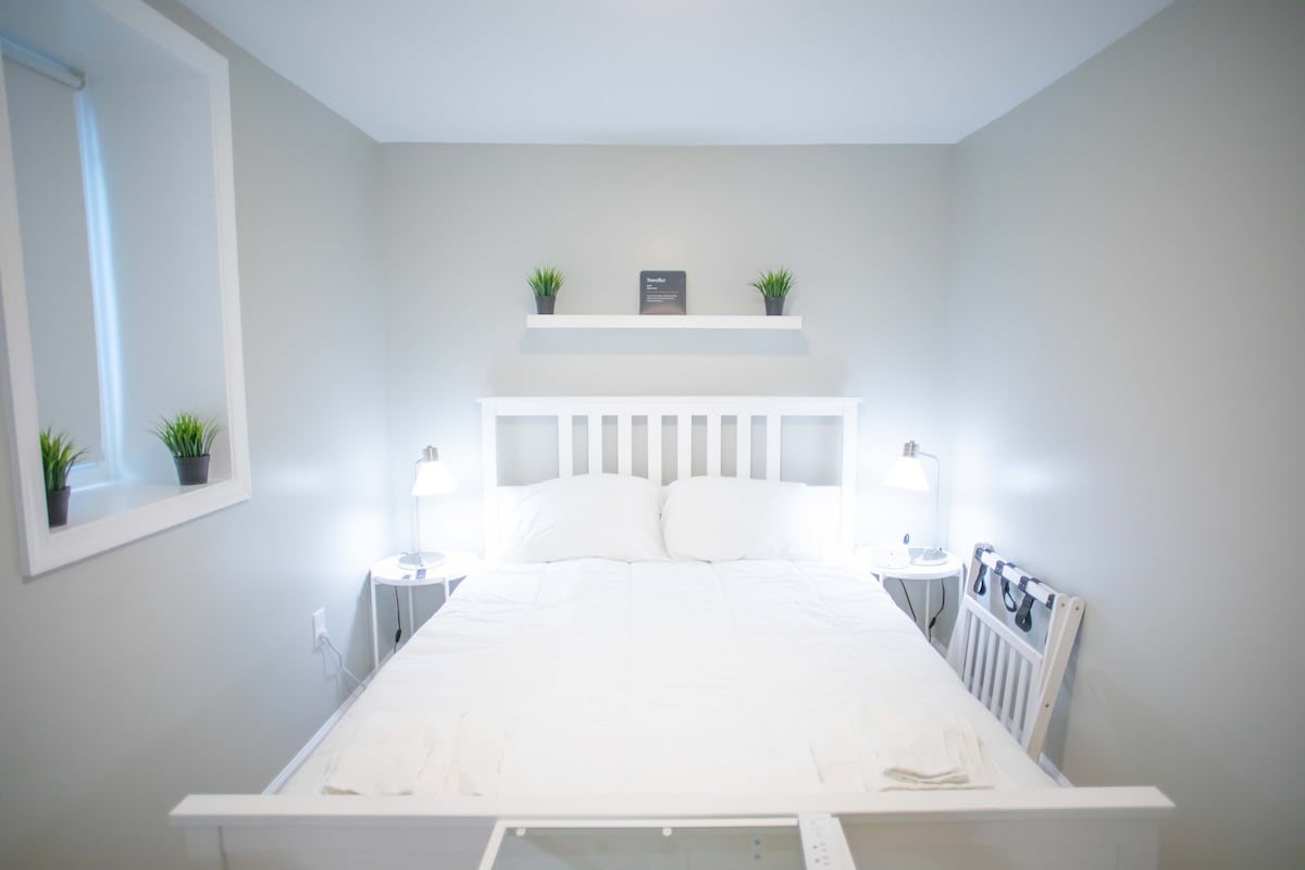 Notre logement confortable est simpliste, mais efficace pour se reposer après une longue journée en voiture ou en ville. Cet appartement au sous-sol dispose d'une entrée séparée à l'arrière du logement. Ce N'EST PAS un espace partagé. Il y a un grand parking gratuit dans la rue pour ceux qui conduisent. Mon logement est parfait pour une escapade simple et tranquille. Les frais supplémentaires sont les suivants : les frais d'arrivée anticipée varient de 10 $ à 30 $ ( selon l'heure), 6 $ pour laver/sécher par chargement, pas de frais de ménage.