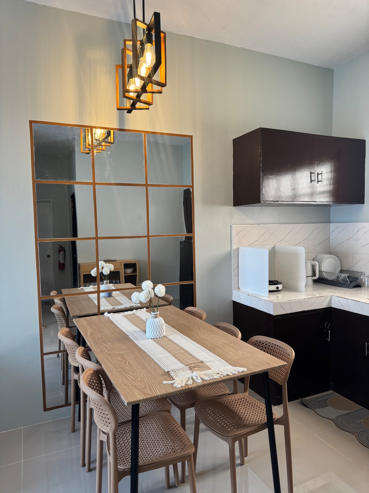Nichée en plein cœur de la ville de Mati, ce logement chaleureux et accueillant est idéalement situé à tout. Le logement se trouve dans un endroit sûr et isolé et offre un parking dans l'allée et de nombreuses places de stationnement devant la maison. La maison a été récemment construite avec des plafonds hauts et d'énormes fenêtres coulissantes pour se détendre. Notez qu'il ne s'agit pas d'une maison de plage, la plage du Dahican et d'autres plages sont à au moins 15 minutes en voiture.
