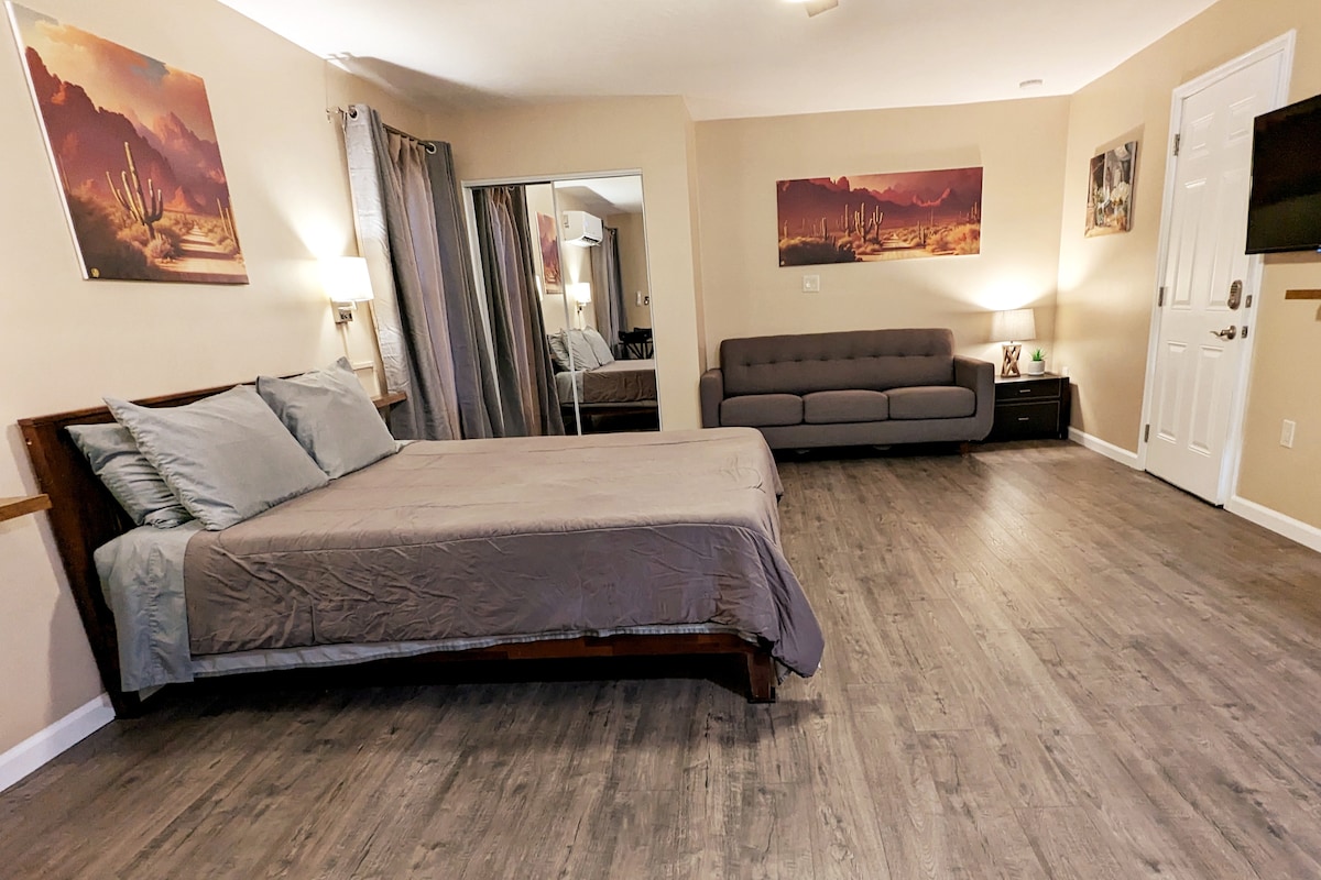 Nouvellement rénové et amélioré ! Studio privé et spacieux (plus de 400 pieds carrés), propre et confortable avec salle de bain privée. Pas de frais de ménage. Vue imprenable sur le magnifique désert de Sonora. Très pratique pour les routes principales (Cave Creek, Carefree HWY). Intimité totale des hôtes avec entrée privée + portes verrouillables. Système de purification d'eau pour toute la maison. Étant une propriété équestre, les voyageurs qui aiment les chevaux adoreront avoir la vue relaxante des chevaux errant dans la propriété. Permis Cave Creek n° 766818