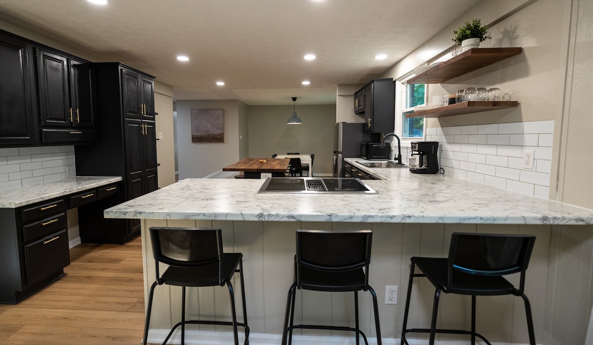 Bienvenue à la ferme Honeysuckle. Il s'agit d'un chalet de 2 chambres, 1,5 salle de bain entièrement rénové avec une décoration design rénovée, niché sur un terrain boisé de 1 acre. Profitez d'une matinée paisible sur les sentiers ou préparez un repas dans une cuisine entièrement équipée. Aventurez-vous à quelques minutes de Broadripple Avenue, du centre commercial Keystone Fashion Mall, de l'université Butler ou à 15 minutes en voiture du centre-ville d'Indianapolis. Quartier calme et sûr avec un grand parking et des propriétaires locaux.