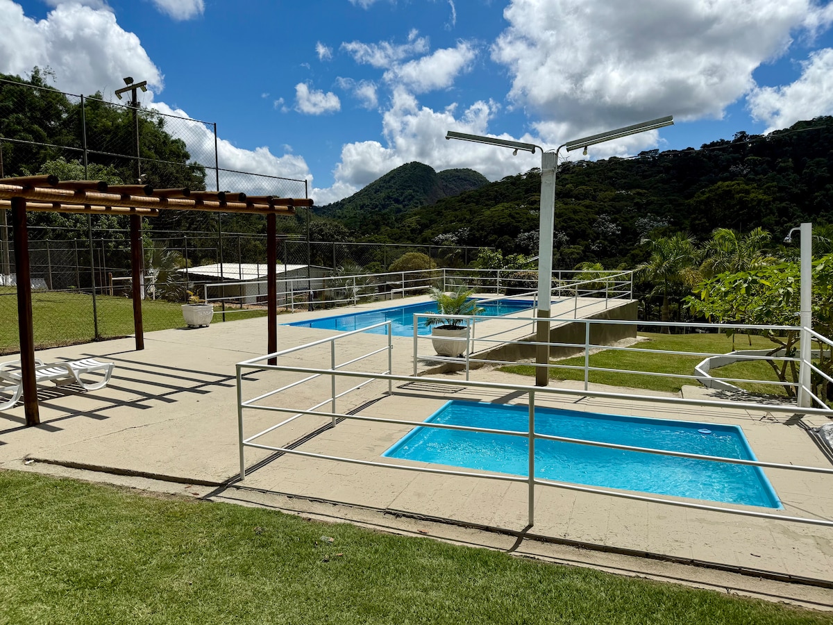 Chalet de montagne, avec de belles vues, idéal pour se reposer et profiter de la nature. Animaux de bienvenue. Le chalet se trouve à l'intérieur du site de Tocas, isolé du siège. Nous sommes situés dans le brejal, à environ 2h30de Rio de Janeiro et à 40 min d'Itaipava. Joli climat, froid la nuit, idéal pour éclairer la cheminée. Chalé dispose d'une suite, d'une chambre double et d'une chambre simple, le tout au deuxième étage du Chalet. Le premier étage dispose d'une chambre intégrée avec cuisine, salle de bains, balcon et piscine