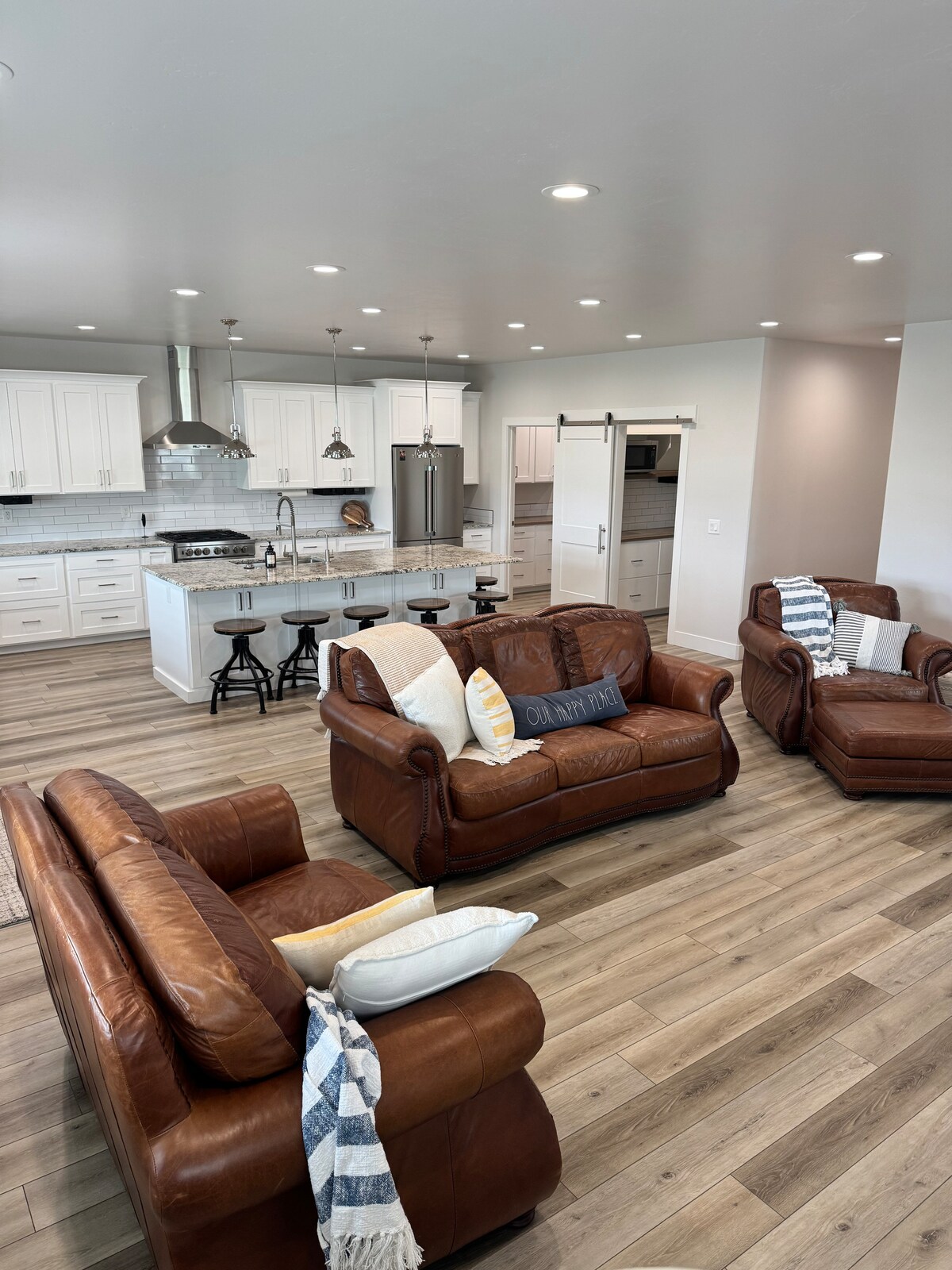 Il s'agit d'un appartement dans un bâtiment de style barndominium qui dispose de deux unités d'hôtes séparées. L'entrée et la chambre sont au rez-de-chaussée, avec deux lofts au-dessus. Un lit queen size au rez-de-chaussée, ainsi qu'une kitchenette (pas de lave-vaisselle), deux salles de bains et une buanderie complète. Des échelles de style bateau mènent aux lofts de couchage qui contiennent six lits jumeaux et deux lits queen supplémentaires. Peut accueillir 12 personnes au total. L'espace de vie et la cuisine sont compacts. La table de salle à manger peut accueillir six personnes.