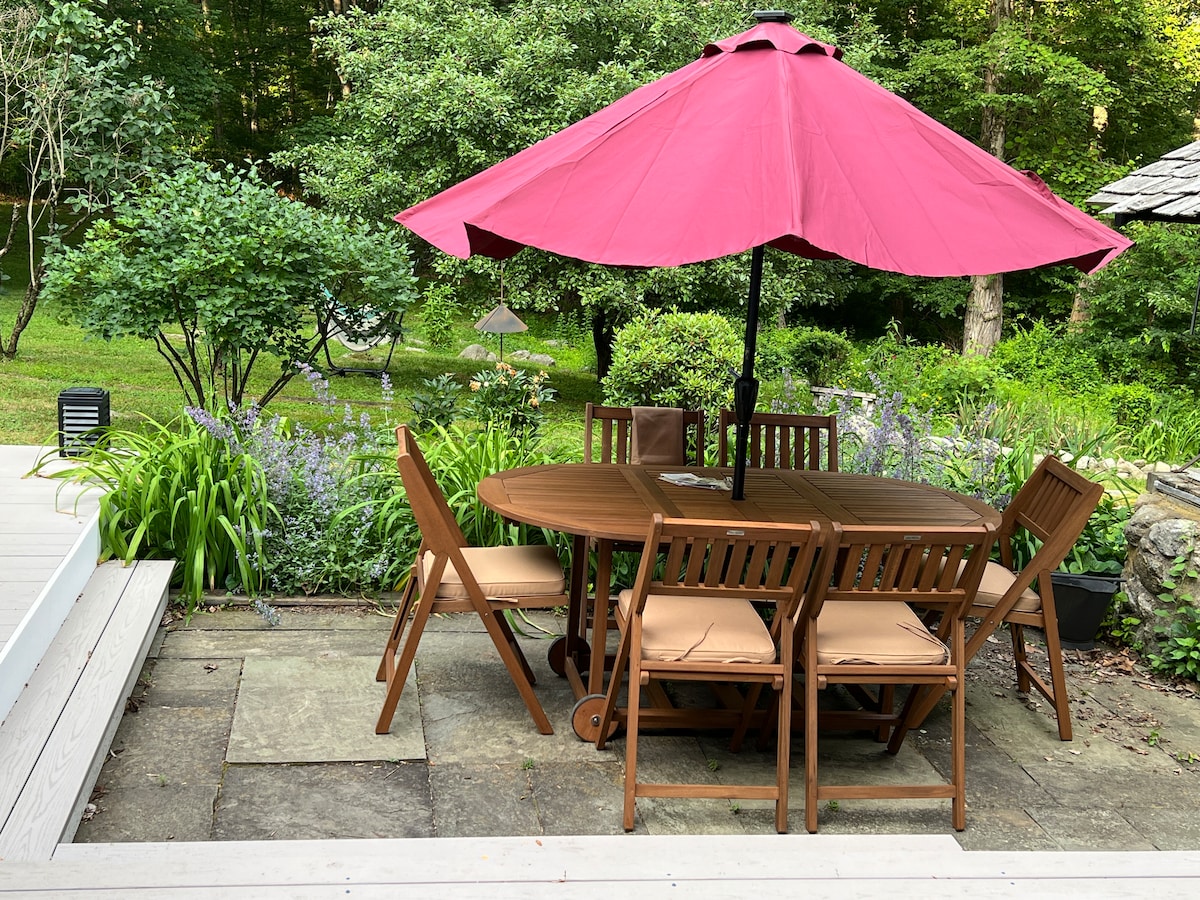 LGBTQ friendly. Our 1915 Arts & Crafts bungalow's spacious in-law suite offers driveway parking, private entrance, sunroom, king bedroom, en-suite bath, kitchenette w/fridge, micro, coffee maker, toaster. Relax in bed with 40" HDTV with Amazon Prime, HBO Max, Netflix, premium cable. Enjoy private gardens to sun, read a book or cup of coffee. Short drive to 4 Vineyards, Theater and the train station. I am not responsible for wifi.