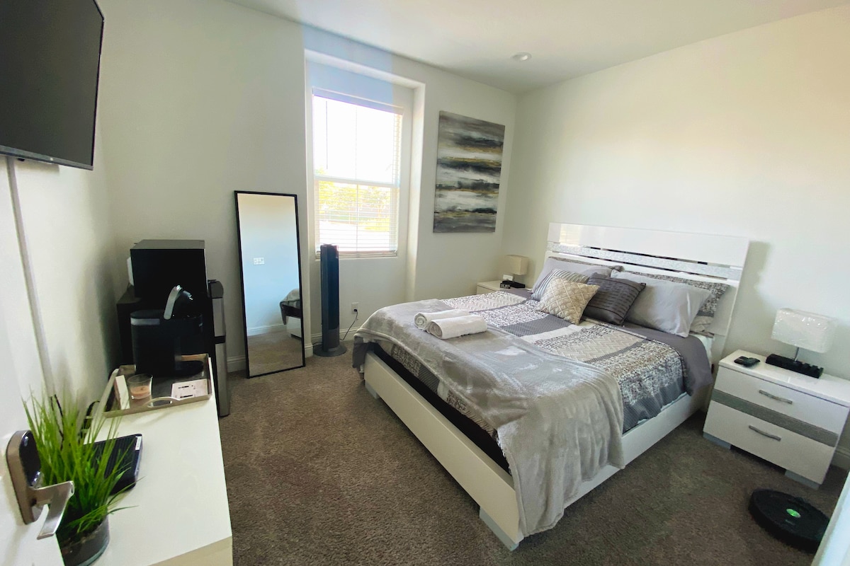 Welcome to our brand-new community! This place is quiet and very safe, conveniently located near Fresno Yosemite International Airport. Around one hour to Yosemite & Sequoia and Kings Canyon.We offer a private suite with full furnishings, including a King Size bed and an oversized desk.The layout features a living room, bedroom, and bathroom, with a private entrance, a small kitchen, and a private bathroom. Additionally, we have a full-size Japanese-style tatami mat available for your use.