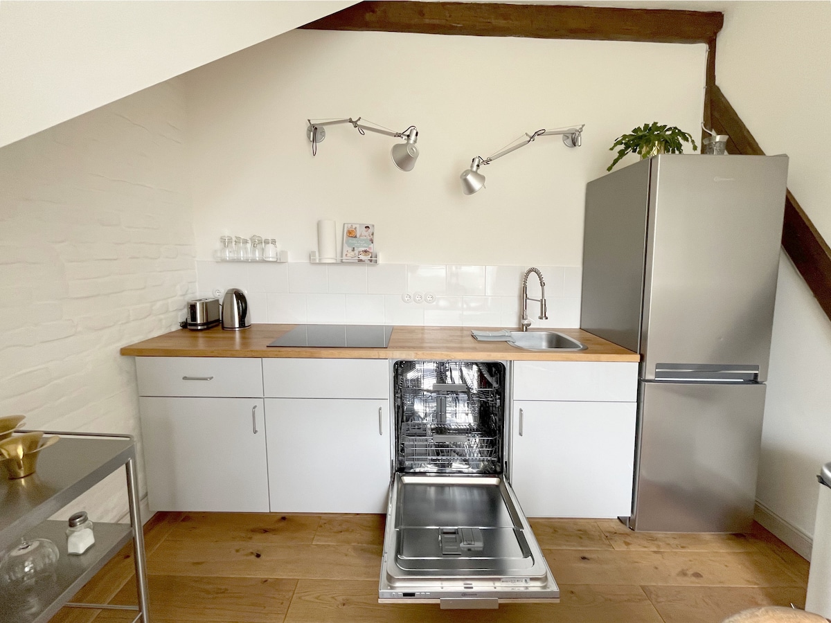 Je me réjouis de t'accueillir au château. L'appartement n° 4 est situé au niveau supérieur (2ème étage) et est orienté vers le nord-ouest, d'où l'on a une vue sur le parc, les douves et le petit lac. Il dispose d'une combinaison chambre-salon, d'une salle de bains complète et d'une cuisine. Il offre le calme et une belle vue sur le paysage du parc.
