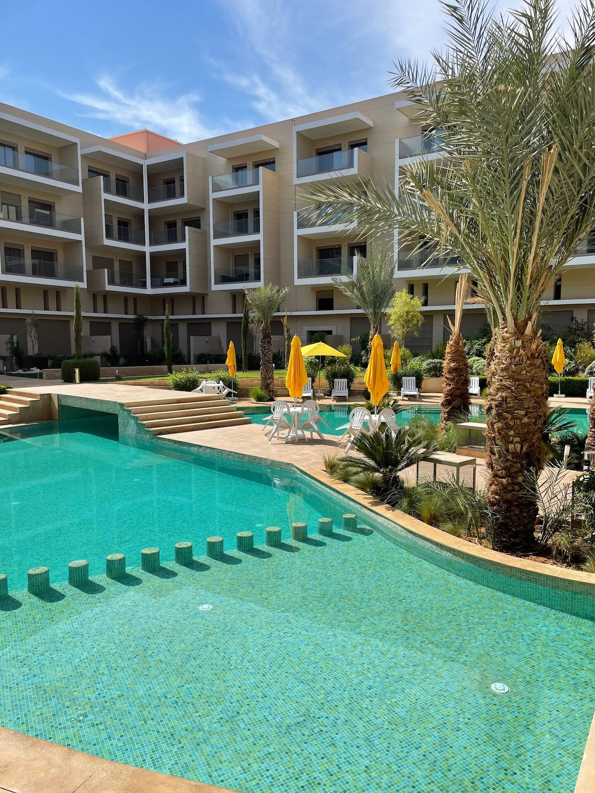 Havre de paix ensoleillé au cœur de la Palmeraie🌴 Appartement lumineux de 82 m² au dernier étage, avec 2 chambres, cuisine équipée, salon, salle d'eau avec douche à l'italienne et 3 grandes terrasses sans vis-à-vis. Résidence sécurisée 24h/24 sur plusieurs hectares avec 2 piscines, bassins d'eau et jardins. À 10 min à pied : supermarché, restaurants, cafés, pharmacie. Idéal pour un séjour en couple, en famille ou entre amis, alliant calme, verdure à seulement 15 minutes du centre ville